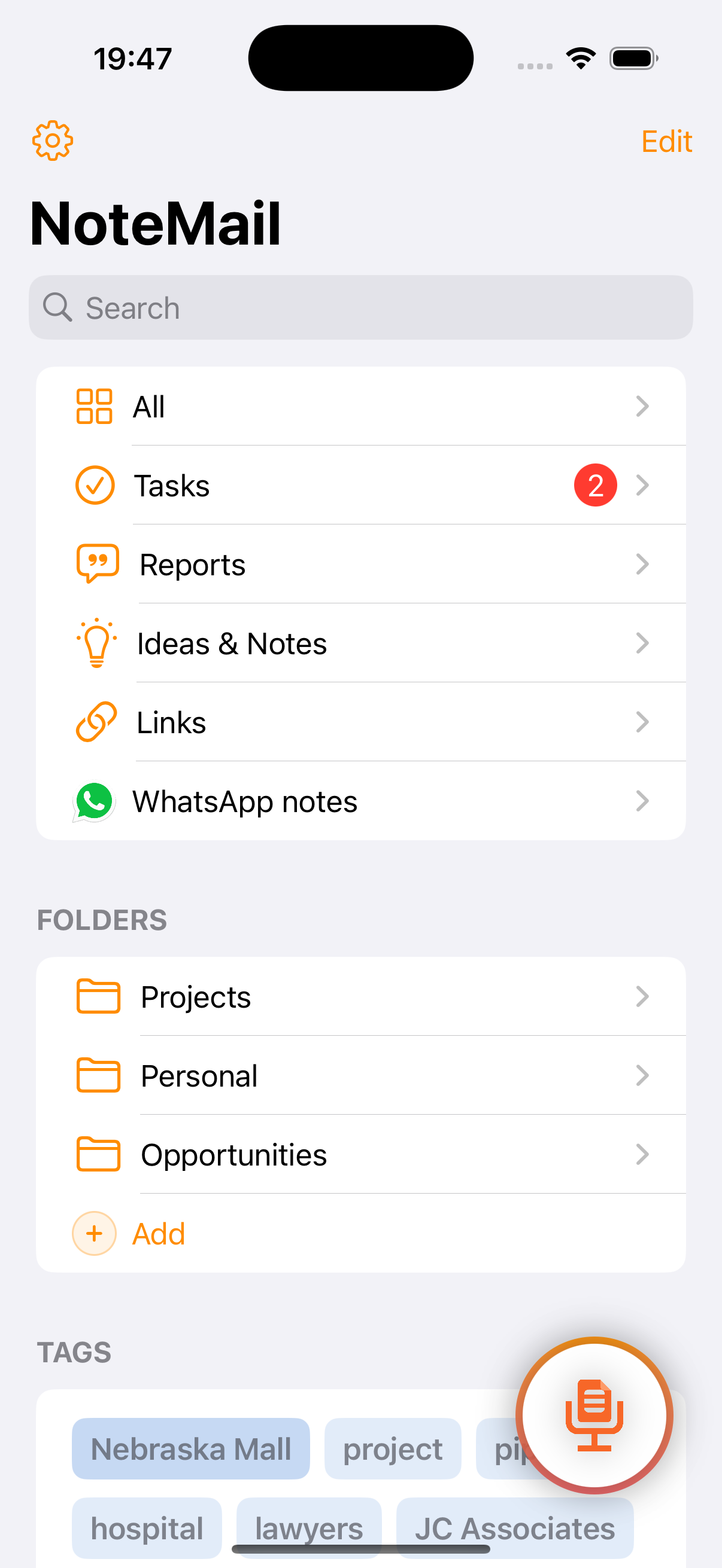 Use NoteMail offline or in cellular mode. Automatically transcribe and organize your thoughts in real-time.