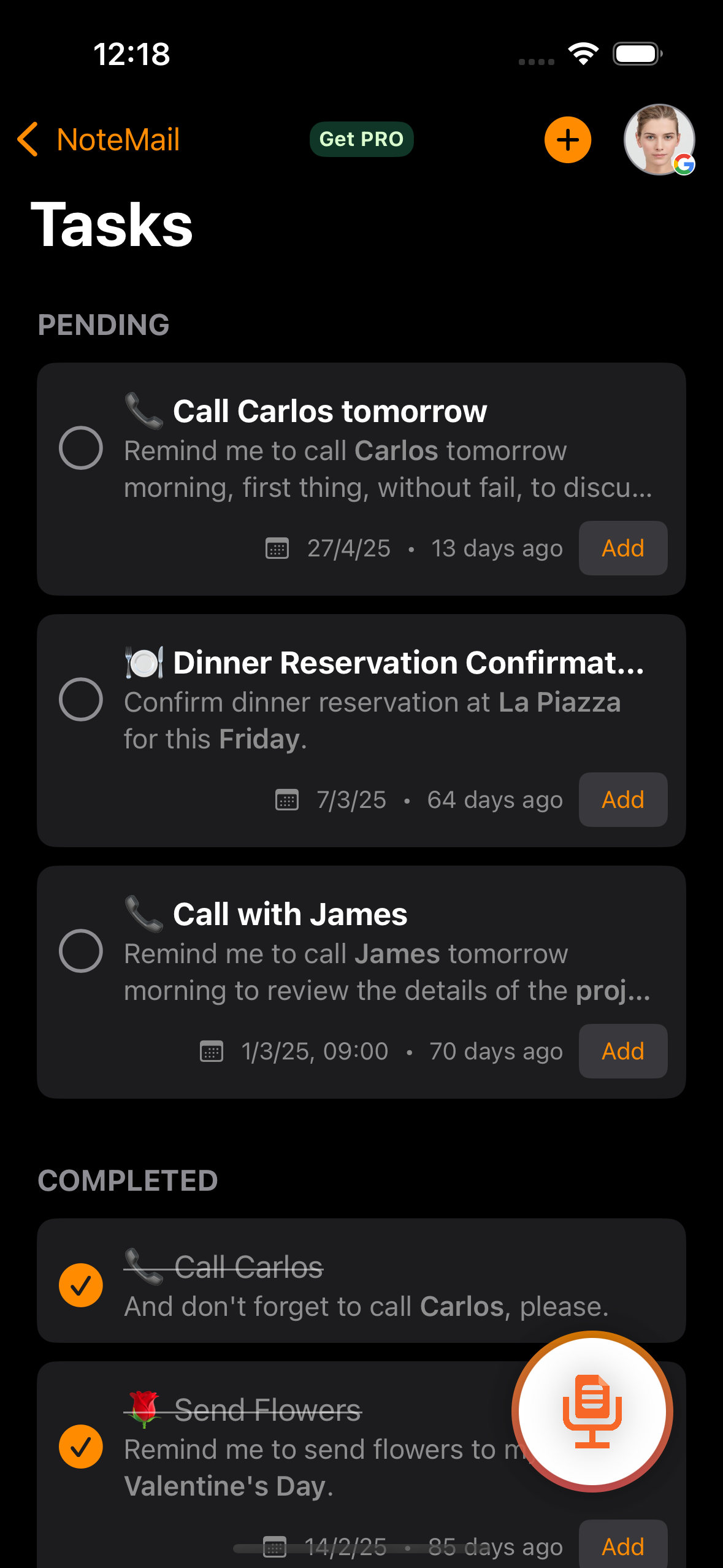 Talk naturally, and NoteMail will capture your tasks and add them to your calendar. The easiest way to create tasks and keep your lists up to date, naturally, with your voice.