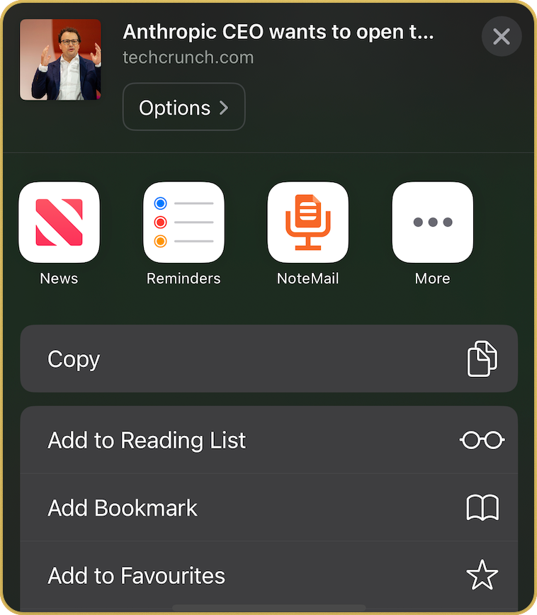 Quickly share articles, websites, or even YouTube videos directly into NoteMail, capturing content effortlessly to revisit later.