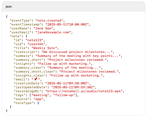 Whenever a note is created or modified, NoteMail sends a webhook with all relevant details. Here’s a sample of what the payload looks like: