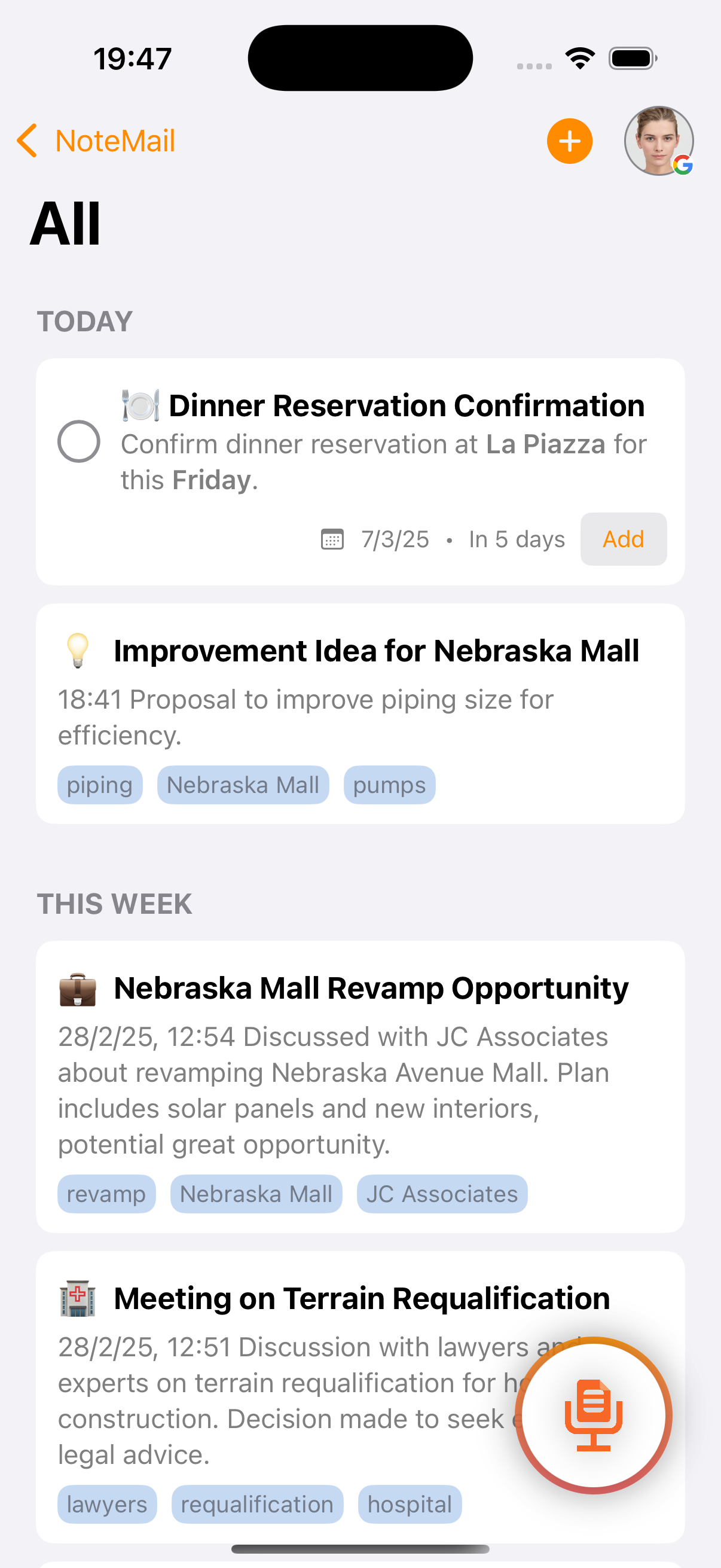 Capture your ideas as they occur, ensuring you never miss a moment of inspiration. Speak naturally, and NoteMail will instantly transcribe and organize your thoughts. Whether it’s a sudden insight or a detailed plan, NoteMail helps you seize the moment and keep your ideas structured and accessible.