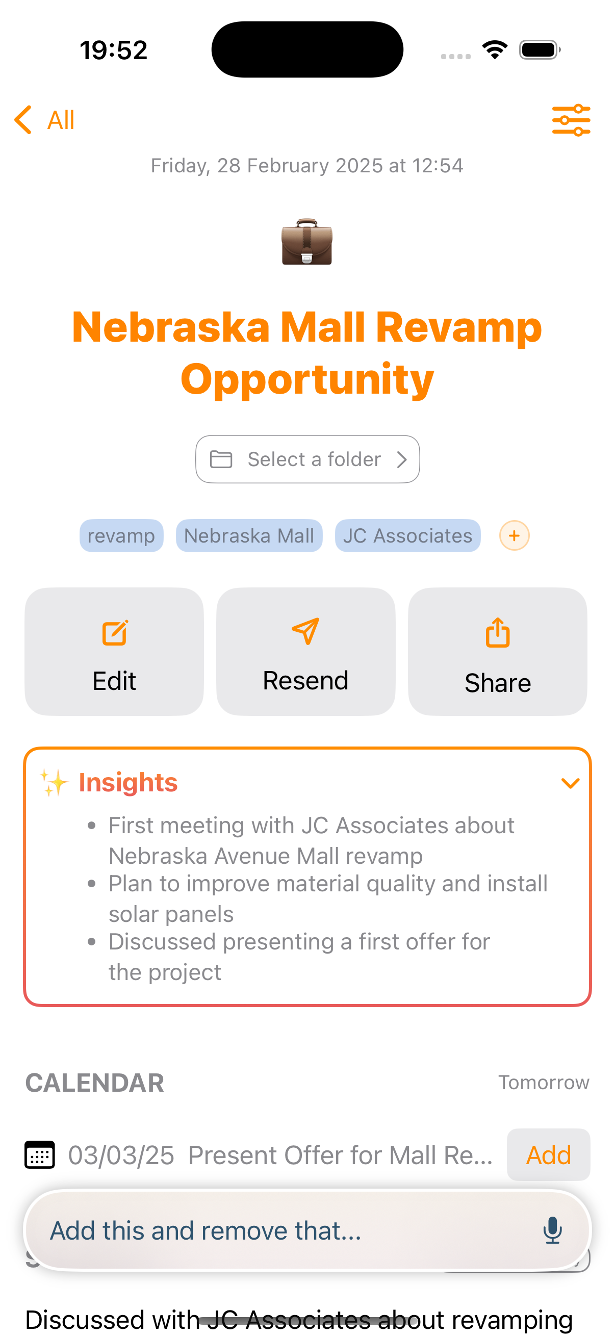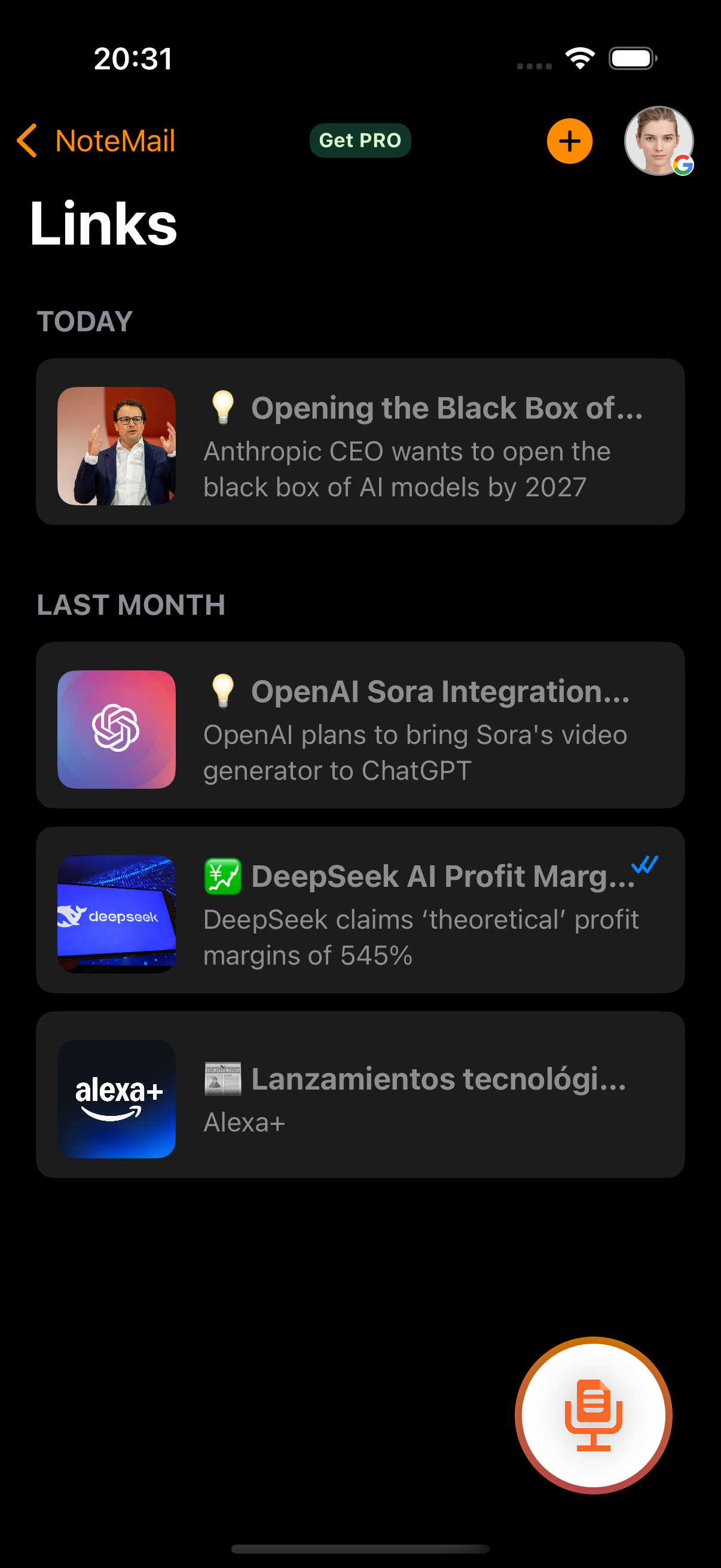 All your voice notes are automatically transcribed and intelligently summarized. Plus, the more you use NoteMail, the better it recognizes your voice and context, continuously improving accuracy.